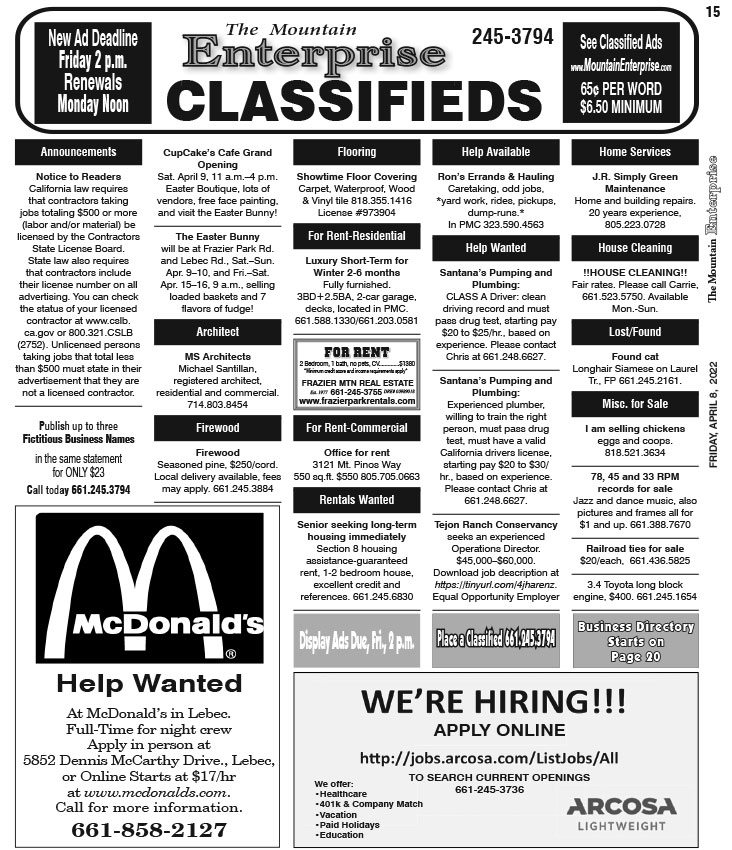 Full Size (732 × 850) | Back to The Mountain Enterprise: Classifieds.